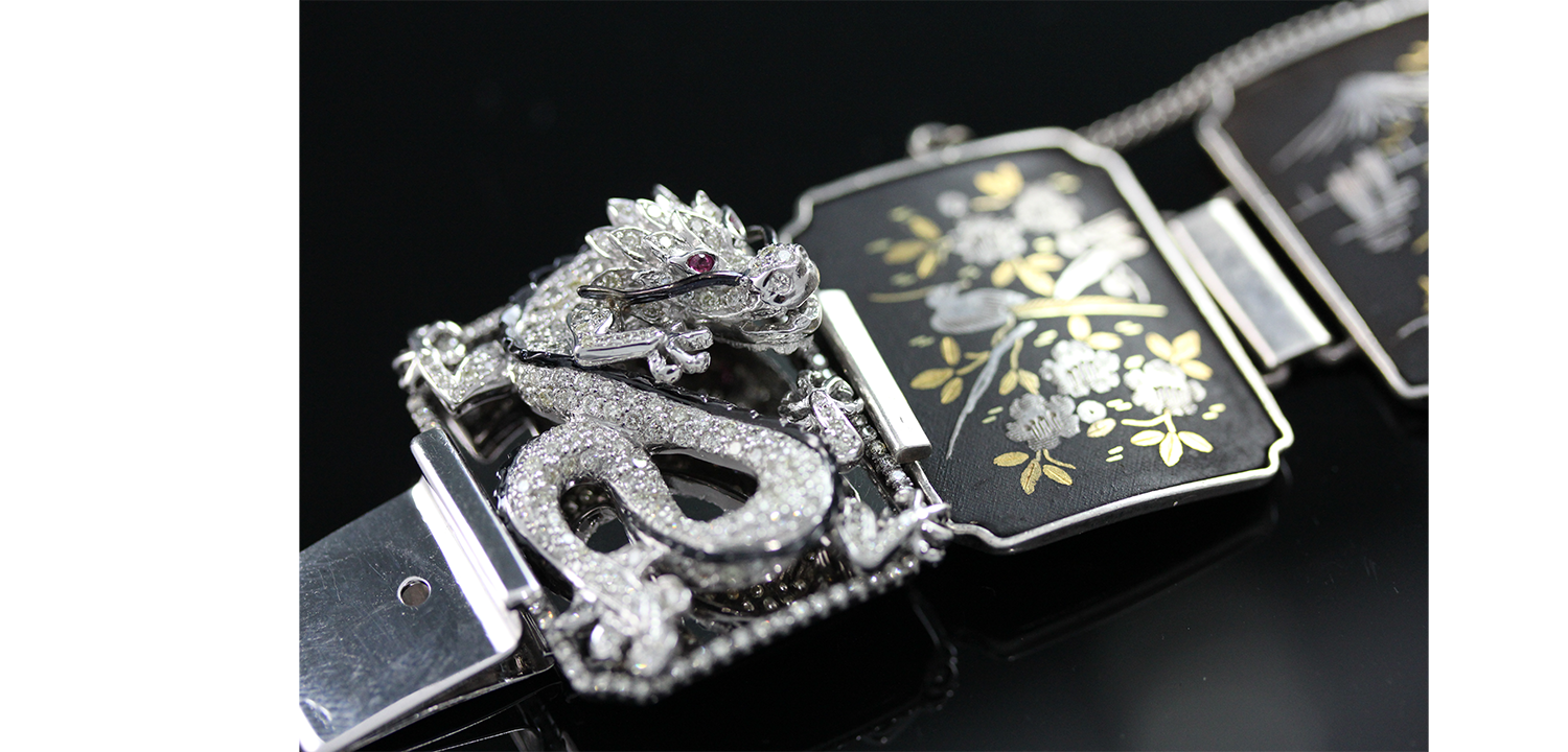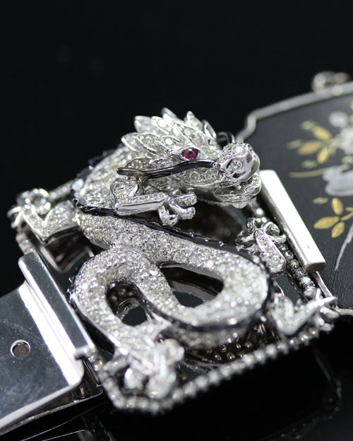 由黃金,K金,白銀漆器鑲嵌,優雅中,帶著東方神龍,器宇軒昂。