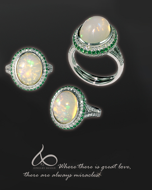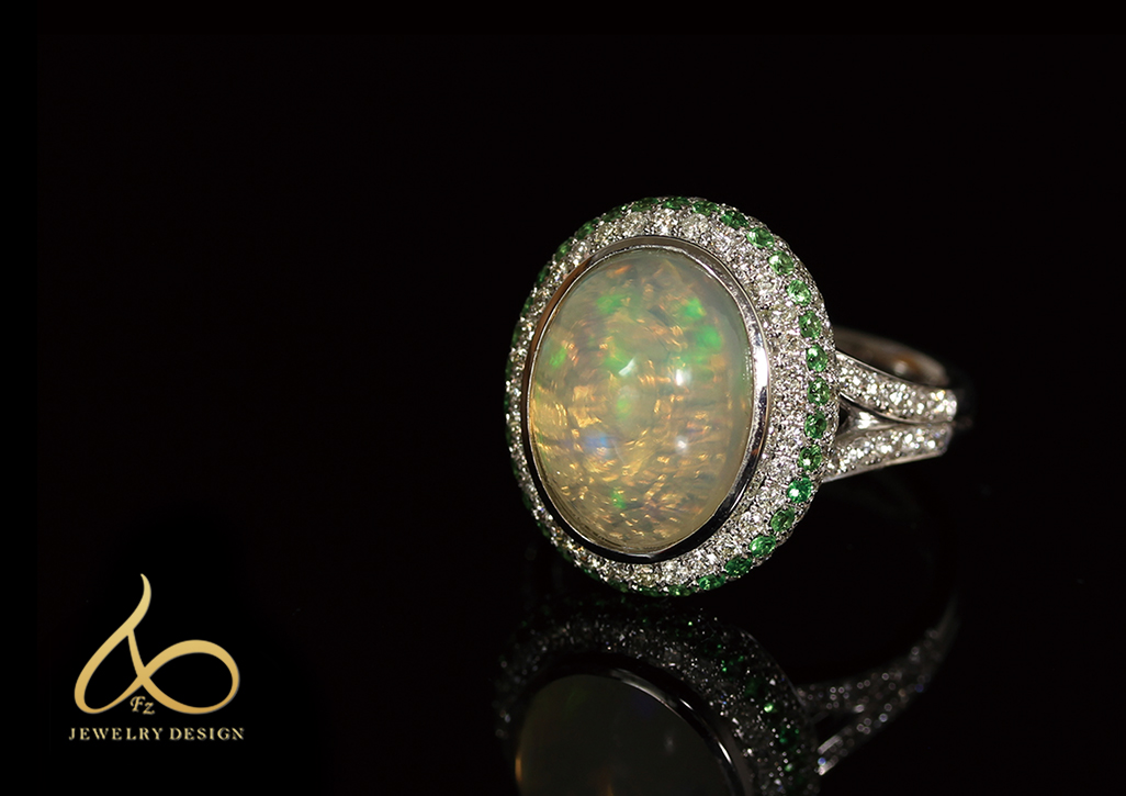 (戒指750k白(寶石底碗鑲滿碎鑽)澳洲蛋白石4.55ct.小鑽112p1.32ct.沙弗萊石)